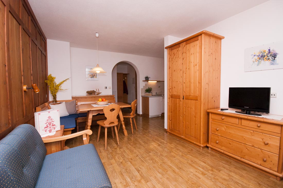 The apartment includes a cosy living room with completely equipped kitchenette, a sitting area and a comfortable sofabed for 2 people. The bedroom with double bed offers enough room to place a cot. Furthermore the apartment has a south-facing balcony with panoramic view on Monte Baranci.